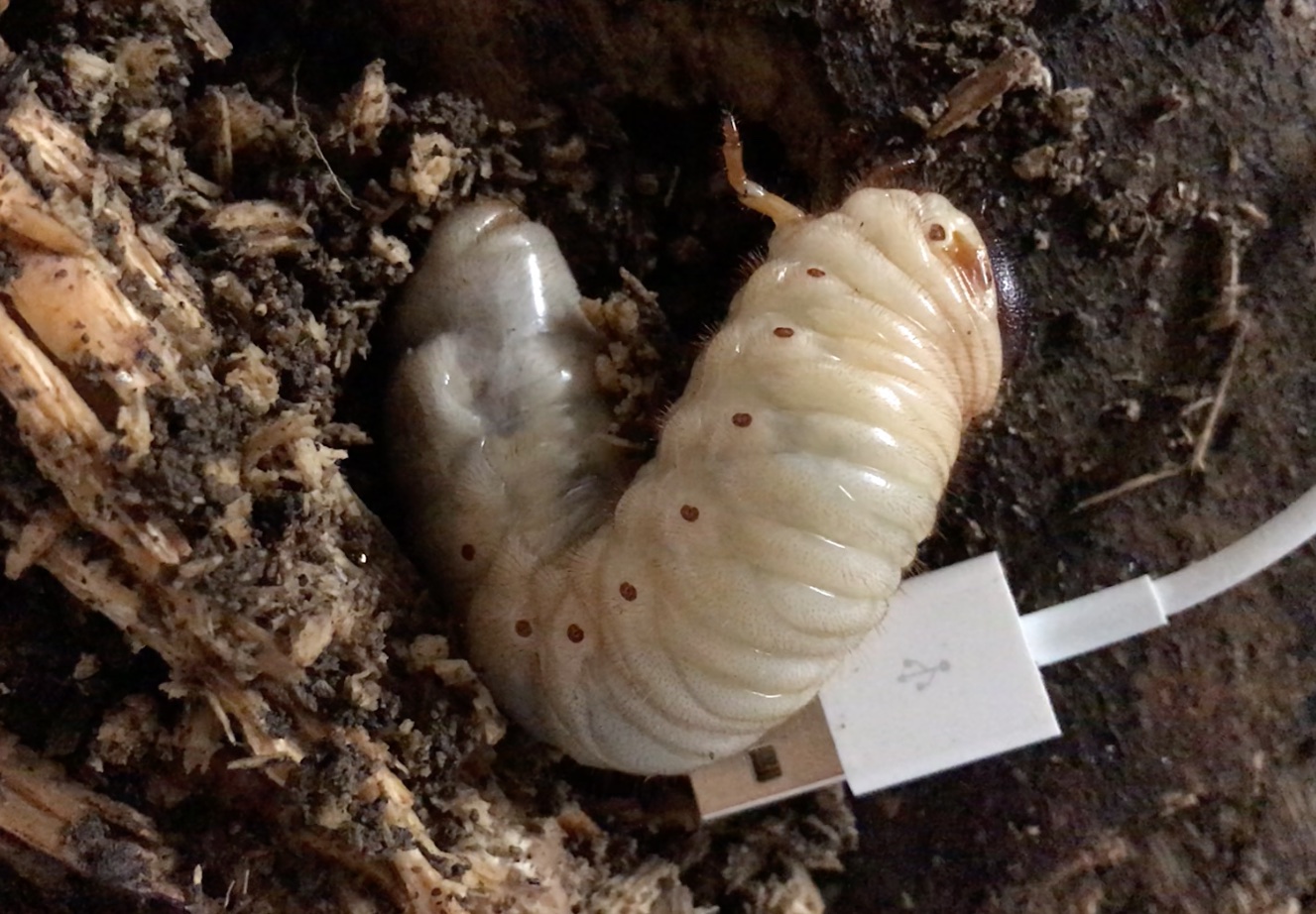 これらの幼虫は、倒木の整理をしていた時に見つけたものです。幼虫の形態と胸部第1節の典型的な模様などからカブトムシであることは明らかです。