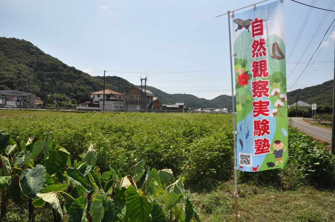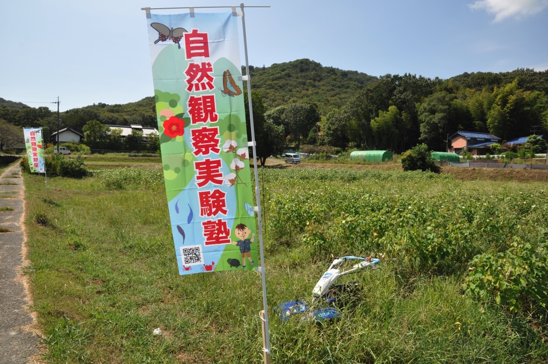 ワタの栽培田に自然観察実験塾の「のぼり」が立つ 2020-08-31 (Mon)
