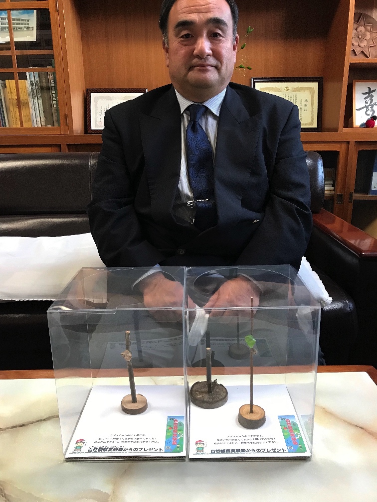 藤本校長は3年生の学習用だけでなく、先生自身も今まで見たことがないアゲハチョウのサナギなので、全校の生徒さんが見られるような場所においておきます、とのことでした。冬を越して、多くの生徒さんたちに注目されながら、羽化することを祈っています。