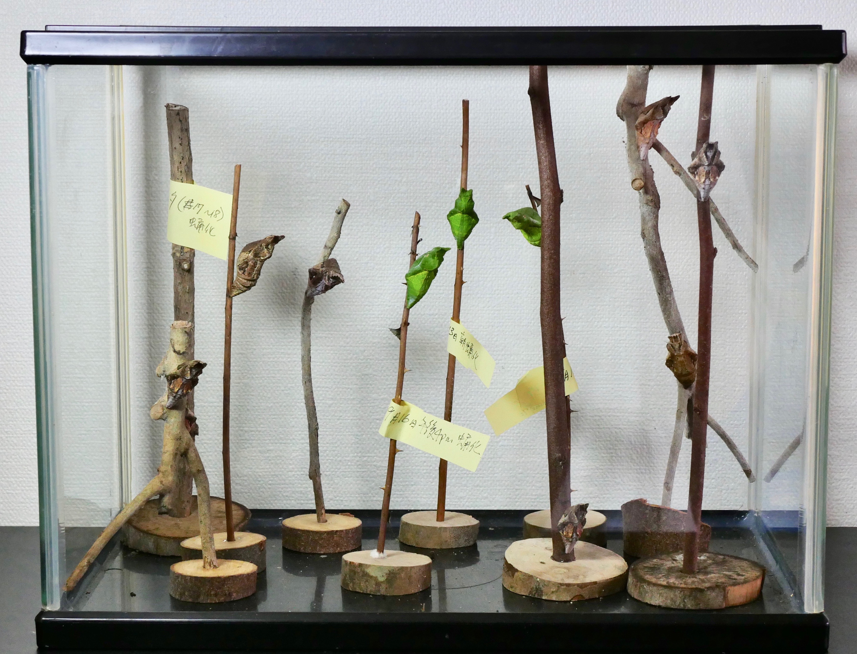 参加者の方々が持ち帰った12匹のアゲハの幼虫が、無事に飼育できなかった時のために、上のような蛹を準備していました。数人の方々は持ち帰り観察しているとのことですが、残りはひょうご環境体験館の方々が羽化等に関する記録を取ってくださる予定です。