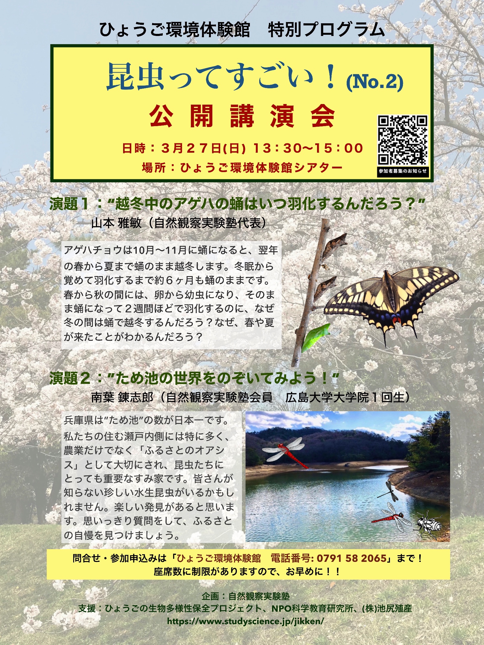 昆虫ってすごい!第2回 於ひょうご環境体験館でのアゲハの蛹の飼育上の問題や、その他の幼虫等の飼育に関する質問に答える予定を少し短縮し、公開講演会を開催した。