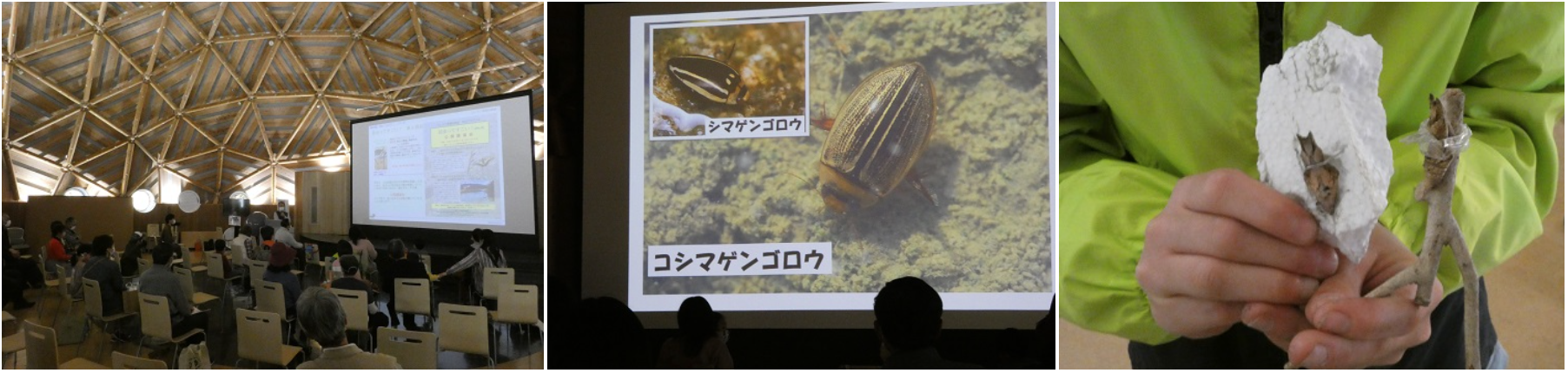 越冬中のアゲハの蛹はいつ羽化するんだろう?の話は、長い越冬の期間蛹のままでいたことを見て、その後の羽化を確認した後の方が良いだろうと判断し、今回は越冬中の幼虫もいるよということと、幼虫の飼育は色々な幼虫の行動も観察しながら飼育できる楽しさ、面白さについての話でした(写真下の左)。また、蛹の具合が悪い場合の救済法についても(写真下の右端)。自然観察実験塾の活動テーマが「ふるさとの自然を守るサイエンス」であることの背景と経緯などの話もありました。