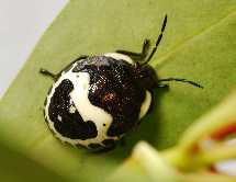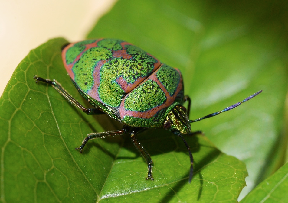 アカスジキンカメムシの幼虫を3匹、アケビにいた2匹と、シキビにいた1匹、を採集しました(下)。この後、脱皮と成虫になってからの体表の色変化の観察が楽しみにも思えましたが、ふと思い直しました。