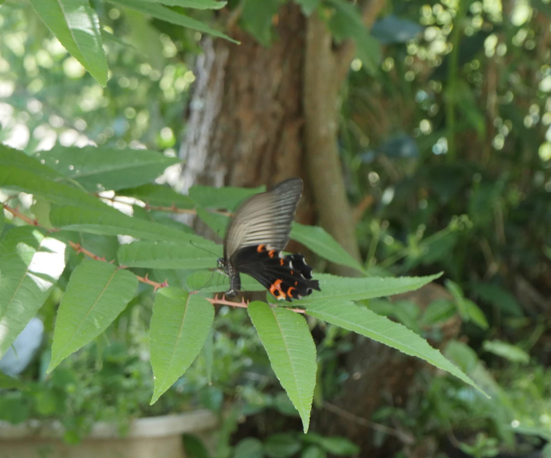 カラスザンショウの匂いに惹かれてやってくるのか、その周りの草や木々に留まりそうになっては、また次へと、ひらりひらりと飛びながら、上の写真のように羽を広げてちょんと止まり、お尻の先端を葉の付け根近くの葉の縁の裏側にチョンっとくっつけました。