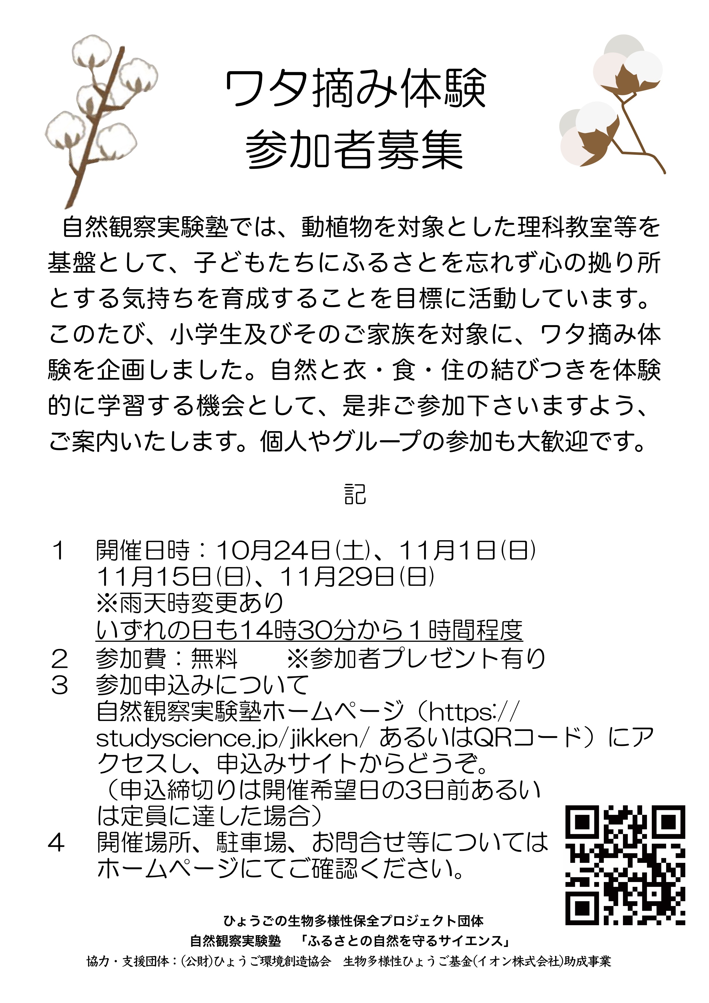 小学生とその保護者、あるいは個人参加を含めてワタ摘み体験参加者を募集した。初めの参加希望者は2組7名であった。小学生は5年生と2年生で、幼稚園や2歳児も田に入って白く開いた綿花(コットンボール)を綺麗ねと言いながら摘んでいました。