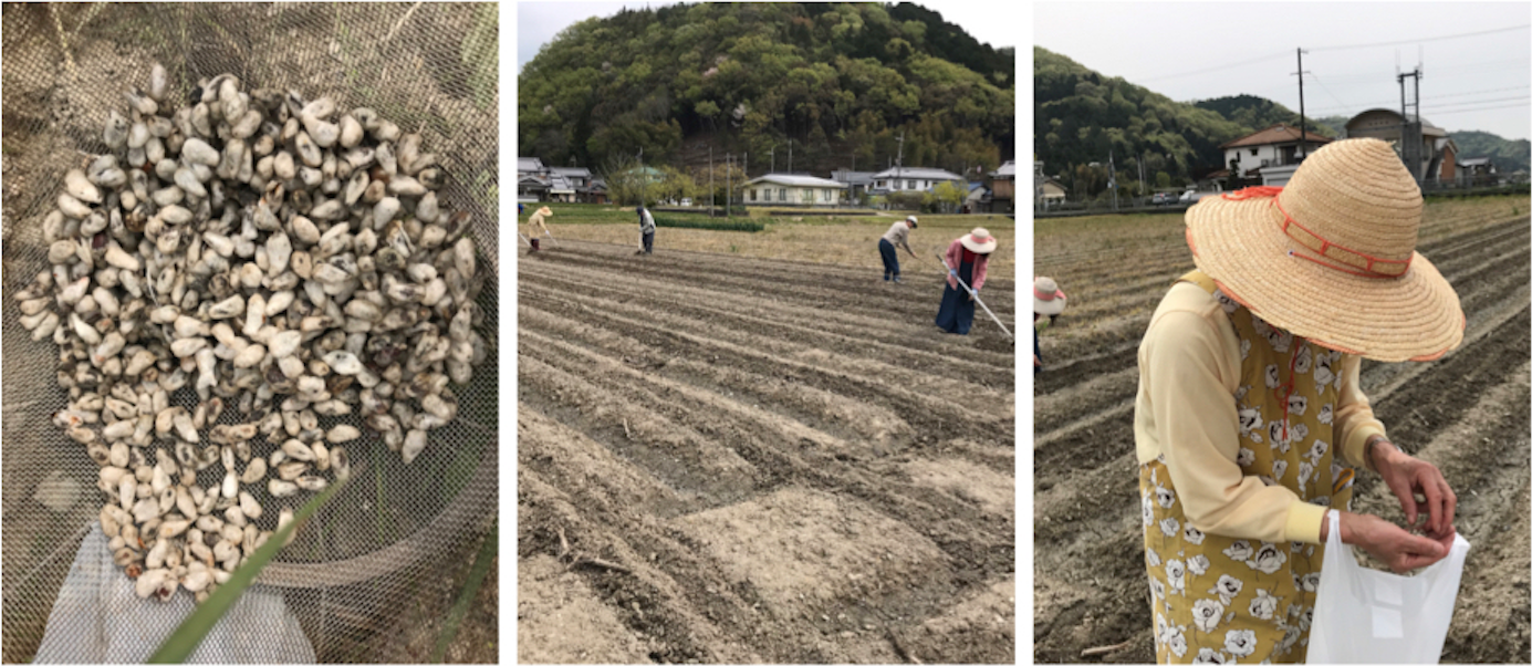 ワタの種は播種日の2日前に水に浸け、次の日に水を換え、蒔く前に取り出します(下図左)。種を蒔く畝に浅く溝をつけていきます。ワタの種は4−5粒を約50~60cm間隔で蒔きます。畝と畝の間隔は約160cmくらいで、コットンボールの収穫をしやすいようにしました(下図中央と右)。