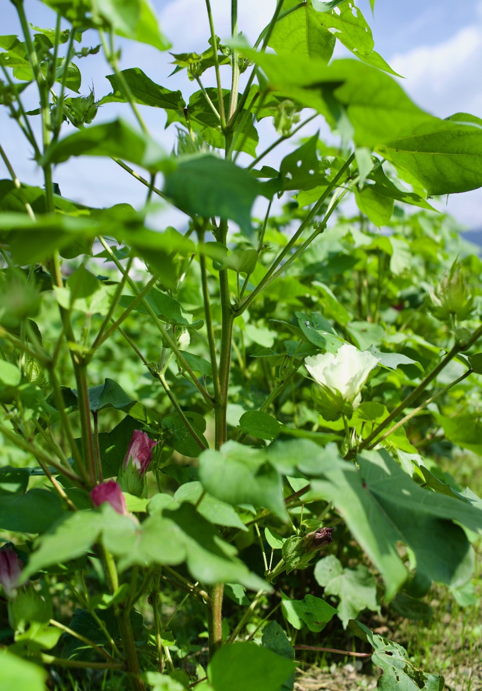 緑の幅広の葉の中に見つかる赤い花がよく目立ちますが、ワタ(洋綿)の花は白です。しかし次の日には色変わりして、ピンクから紫がかった色になりますが、この点の詳細は別に記載する予定です。