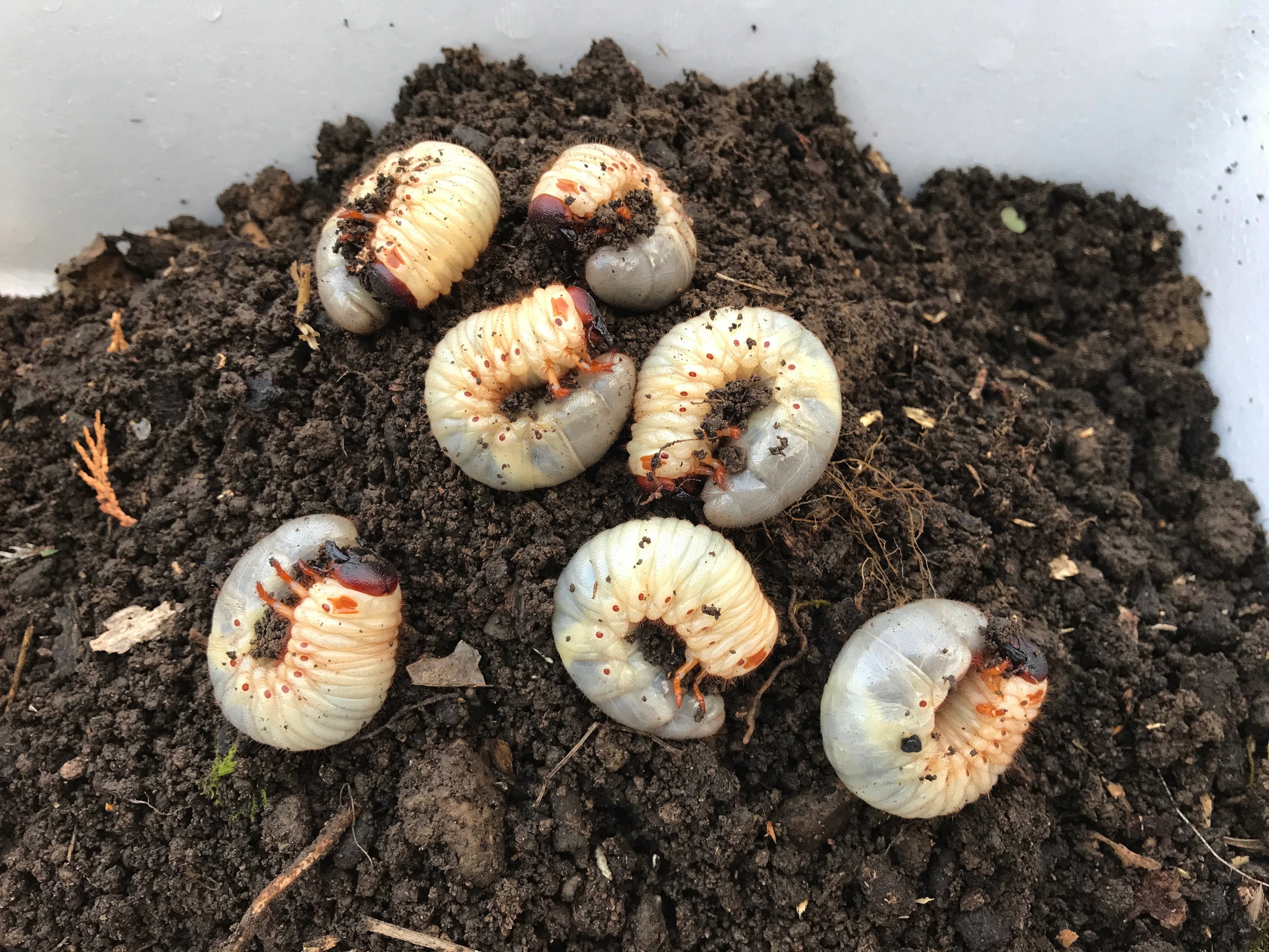これらの幼虫は、倒木の整理をしていた時に見つけたものです。幼虫の形態と胸部第1節の典型的な模様などからカブトムシであることは明らかです。
