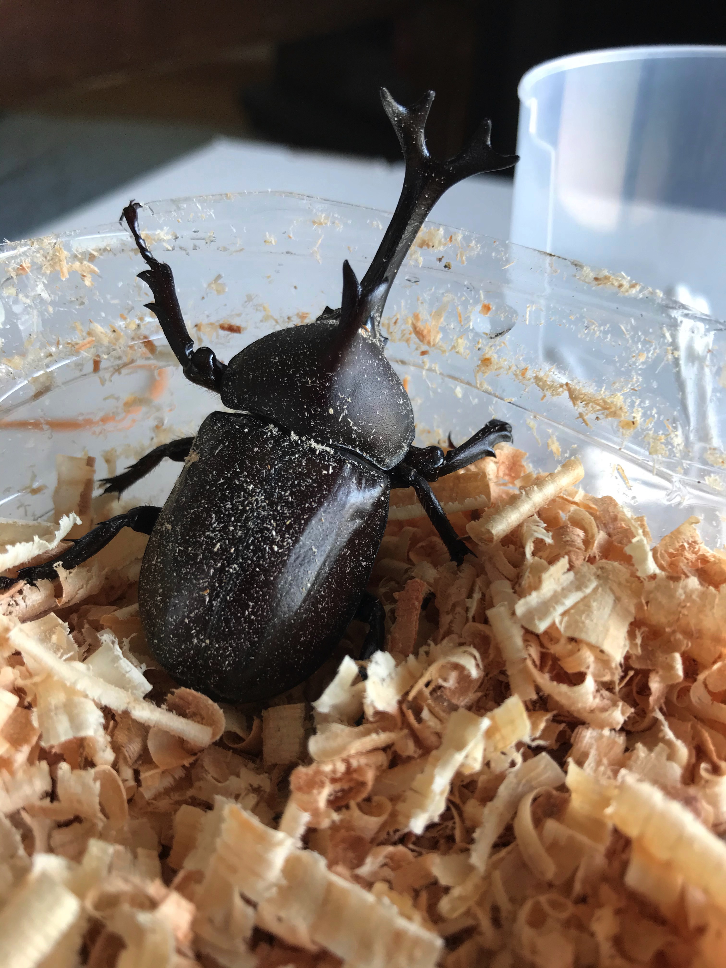 カブトムシの幼虫を22匹飼育していました。その中から、7月19日、第1号の成虫としてこのオスが羽化しました。オスの方が早く羽化するようですね。子供さんに人気の赤カブトのオス・メスもいました。