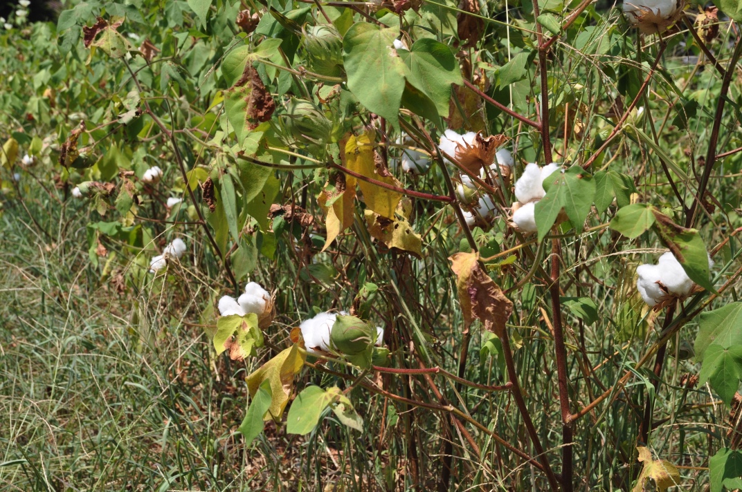 ワタの栽培田には白い花、ピンクの花、大きく膨らんだ実、弾けた綿花などで賑やかです。