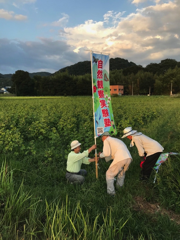 3カ所のワタの栽培田に自然観察実験塾の「のぼり」を立てました。