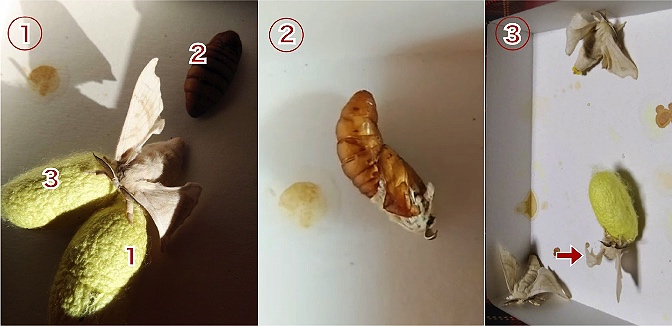 その後、18日、19日と連続ですべて羽化したとのこと。画像まで送信して下さいました。まとめてみたのが上の図です。①②③は羽化した順番で、①内の1、2、3は羽化した繭の順番です。ただし、2は繭を切り中にいた蛹を外に出した状態です。生きている蛹は動くので、生きているのがよくわかります。