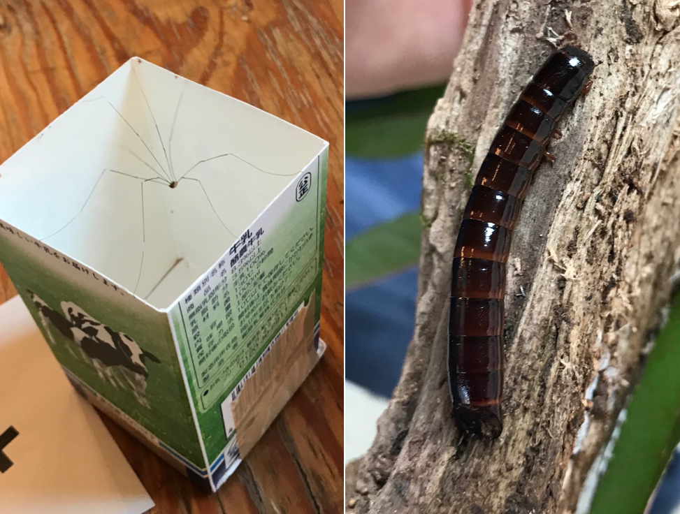 成果としては、ザトウムシ(左)もあれば甲虫キマワリの幼虫(右)もあるなど、さまざまでした。ひょうご環境体験館で栽培していたウマノスズクサはジャコウアゲハ の幼虫に食べ尽くされていて、ジャコウアゲハ の幼虫が見つからなかったのは残念でした。