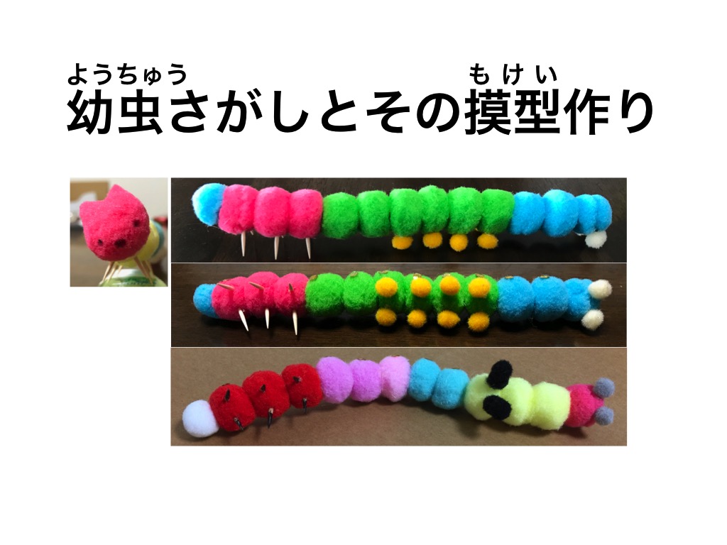 目的は、昆虫の多様性を知るきっかけとして、幼虫の体を丁寧に観察することで学習することです。頭部、胸部、腹部の体節数、成虫になった時の脚は胸部にある3対、幼虫が移動する時に使用する腹脚がどの体節に何対ついているかなどを丁寧に見て、その通りに模型を作ります。さらに気門の無い体節もあるから注意しようと、より完成度の高い模型を目指しました。