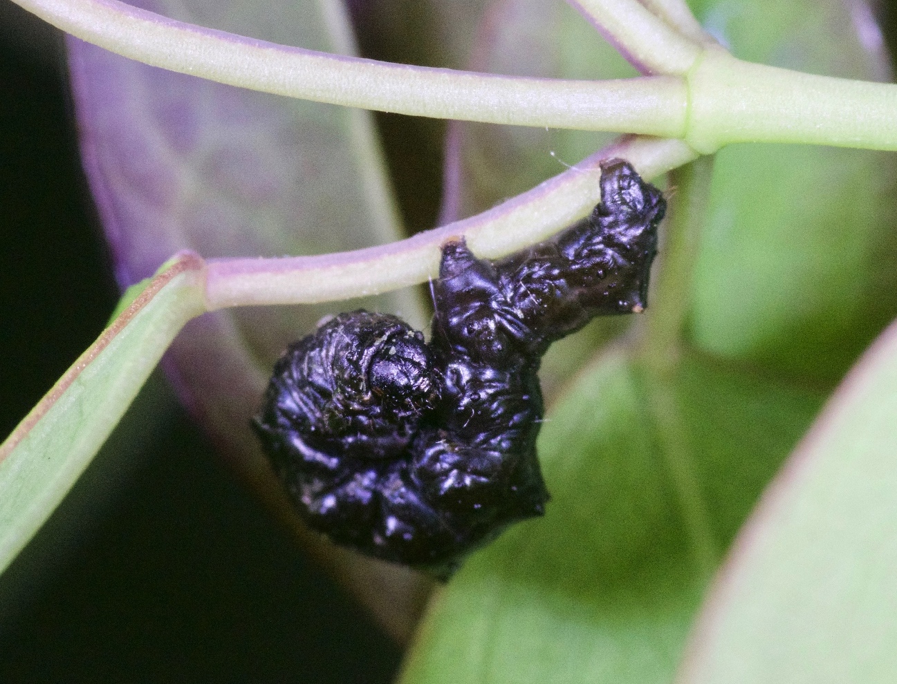 下の写真は、近くのアケビの葉にいたオカモトトゲエダシャクの真っ黒な若齢幼虫(2齢幼虫か)。
