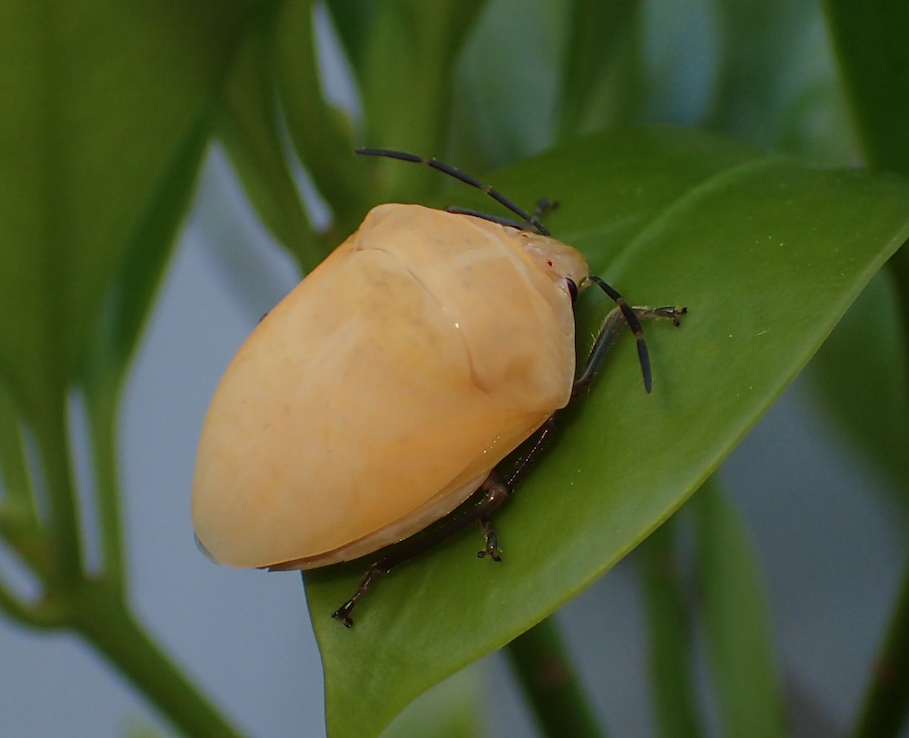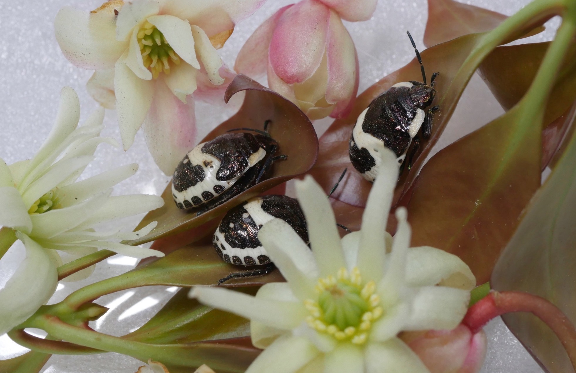 アカスジキンカメムシの幼虫を3匹、アケビにいた2匹と、シキビにいた1匹、を採集しました(下)。この後、脱皮と成虫になってからの体表の色変化の観察が楽しみにも思えましたが、ふと思い直しました。