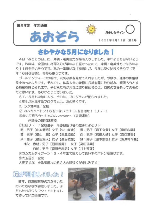 上郡町立山野里小学校では学年通信に羽化の様子を載せていただきました。