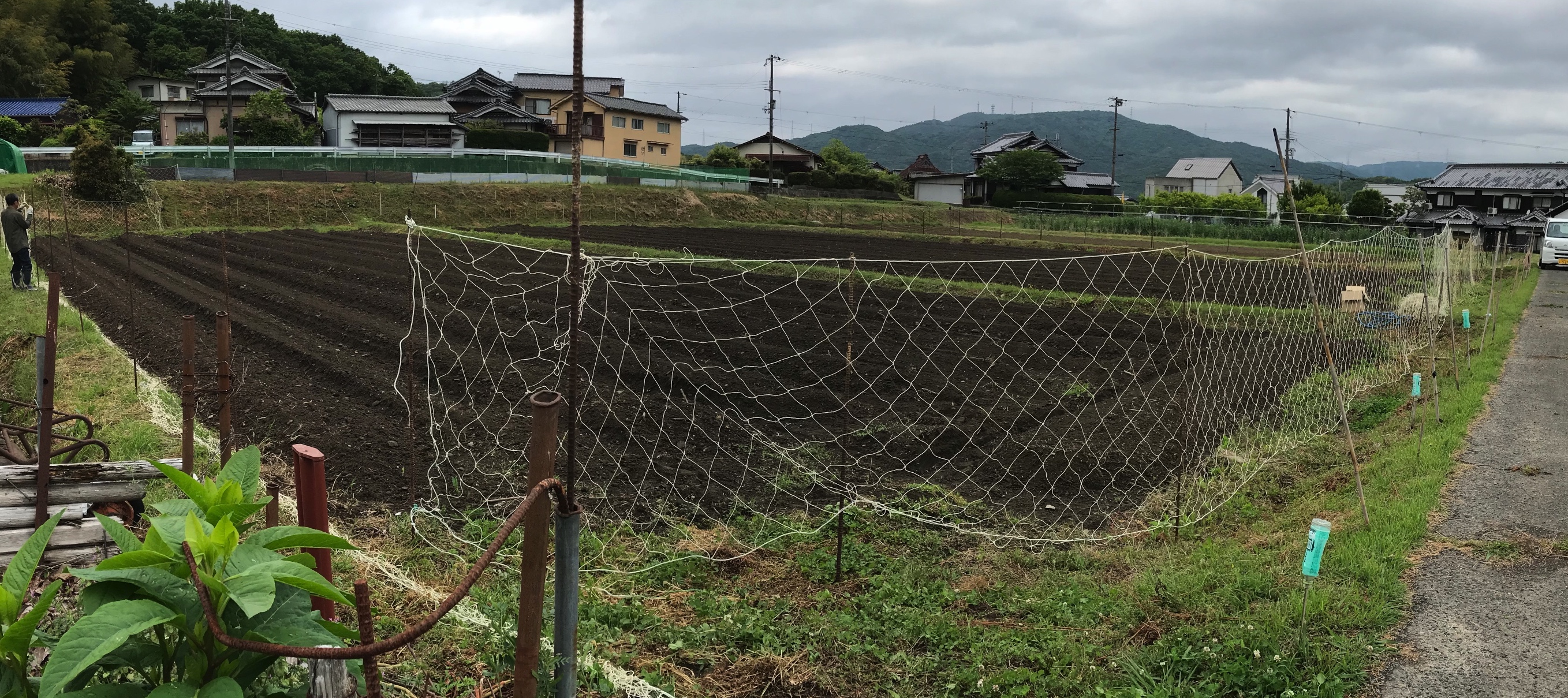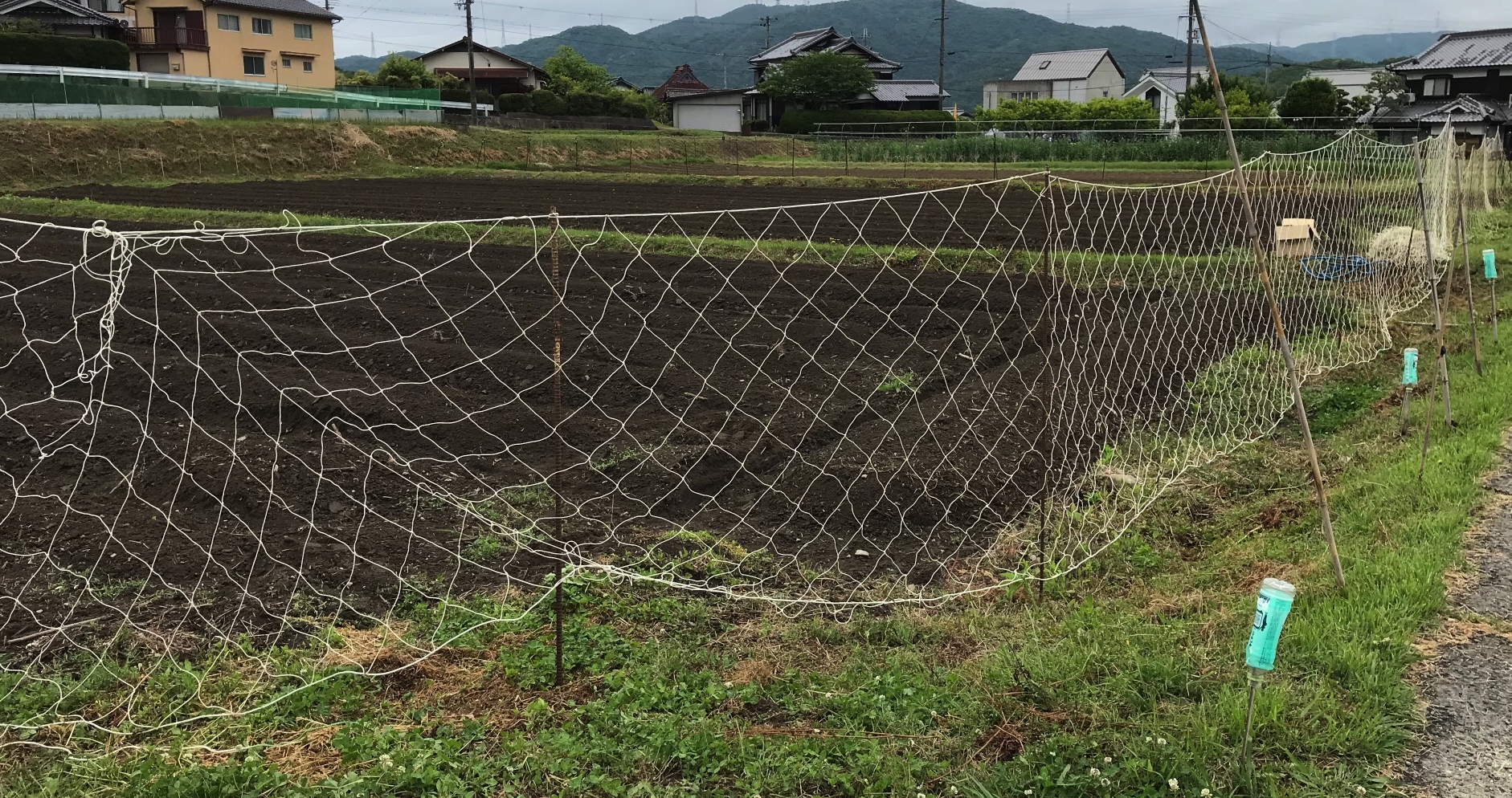 鉄の支柱を立てて、太めの糸のネットを使いました。昨年度から鹿の大きな被害が目立つようになってきたようなので、少しでも多くの収穫量をあげて、参加者の皆さんに喜んでもらおうとの気持ちです。